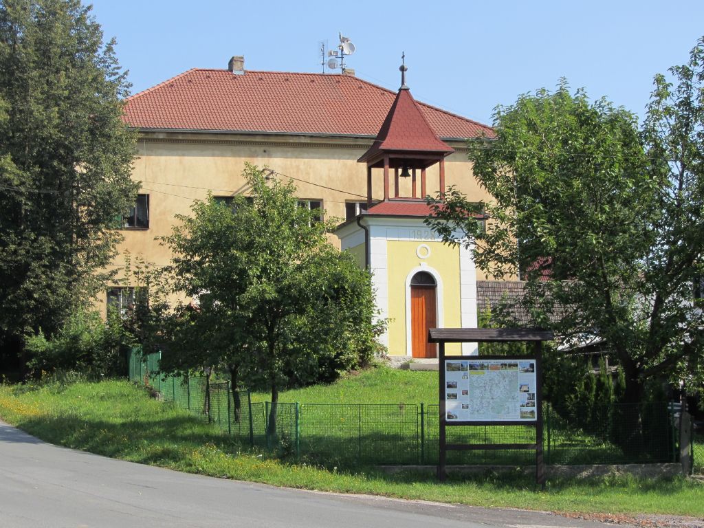 kaplička v Hlohovičkách na návsi, v pozadí bývalá škola